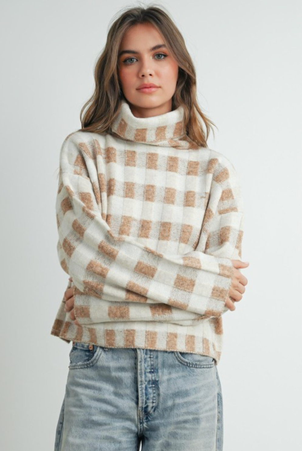 • Stay warm and stylish in our Check Turtleneck Sweater. Made from soft, high-quality fabric, it features a classic check pattern and cozy turtleneck for extra warmth.