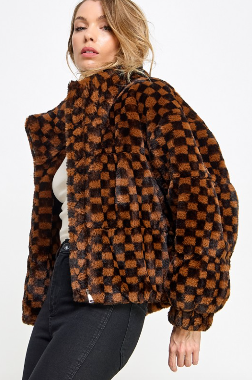 Crafted from ultra-soft faux fur featuring an eye-catching checker pattern, this jacket makes an instant statement.