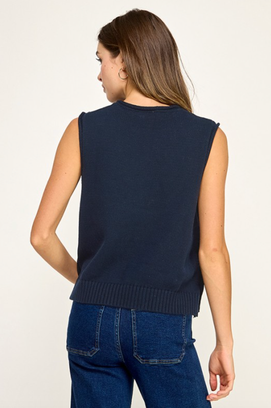 • Round neck waistcoat top with a sleeveless design and gold tone button detail on the sides.