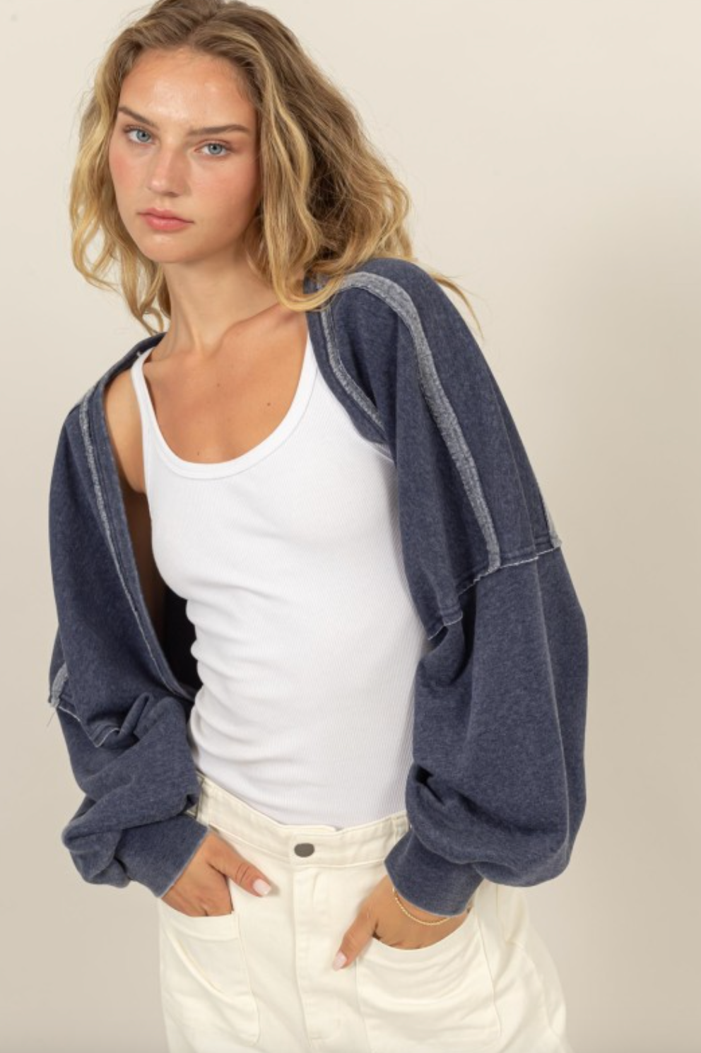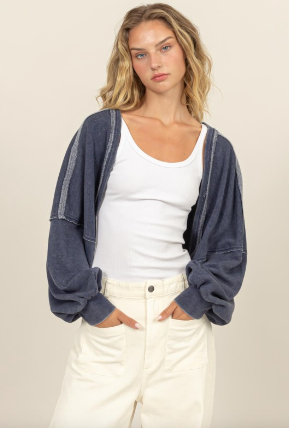 Elevate your style with this oversized contrast cropped shrug featuring bold exposed seams and wide sleeves for a comfy, laid-back vibe. Its relaxed fit makes layering a breeze, while the cozy cotton-polyester blend keeps you snug. Pair it with high-waisted favorites for an effortlessly chic look that’s ready to play all day!