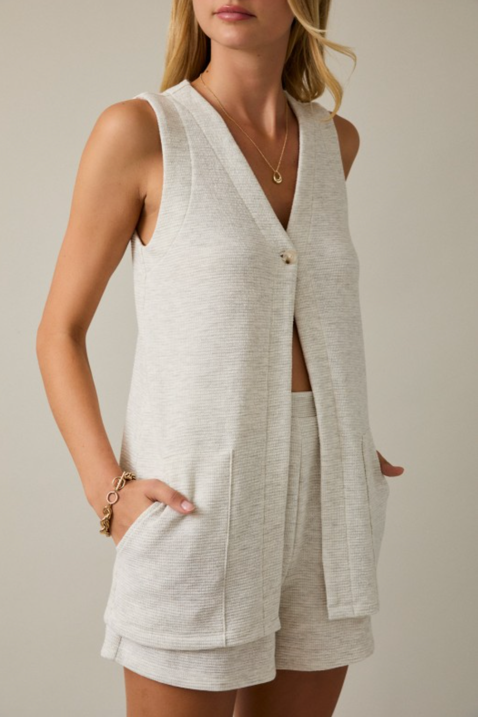 This coordinated two-piece features a sleek vest top paired with elastic waist shorts, perfect for lounging, running errands, or casual outings.