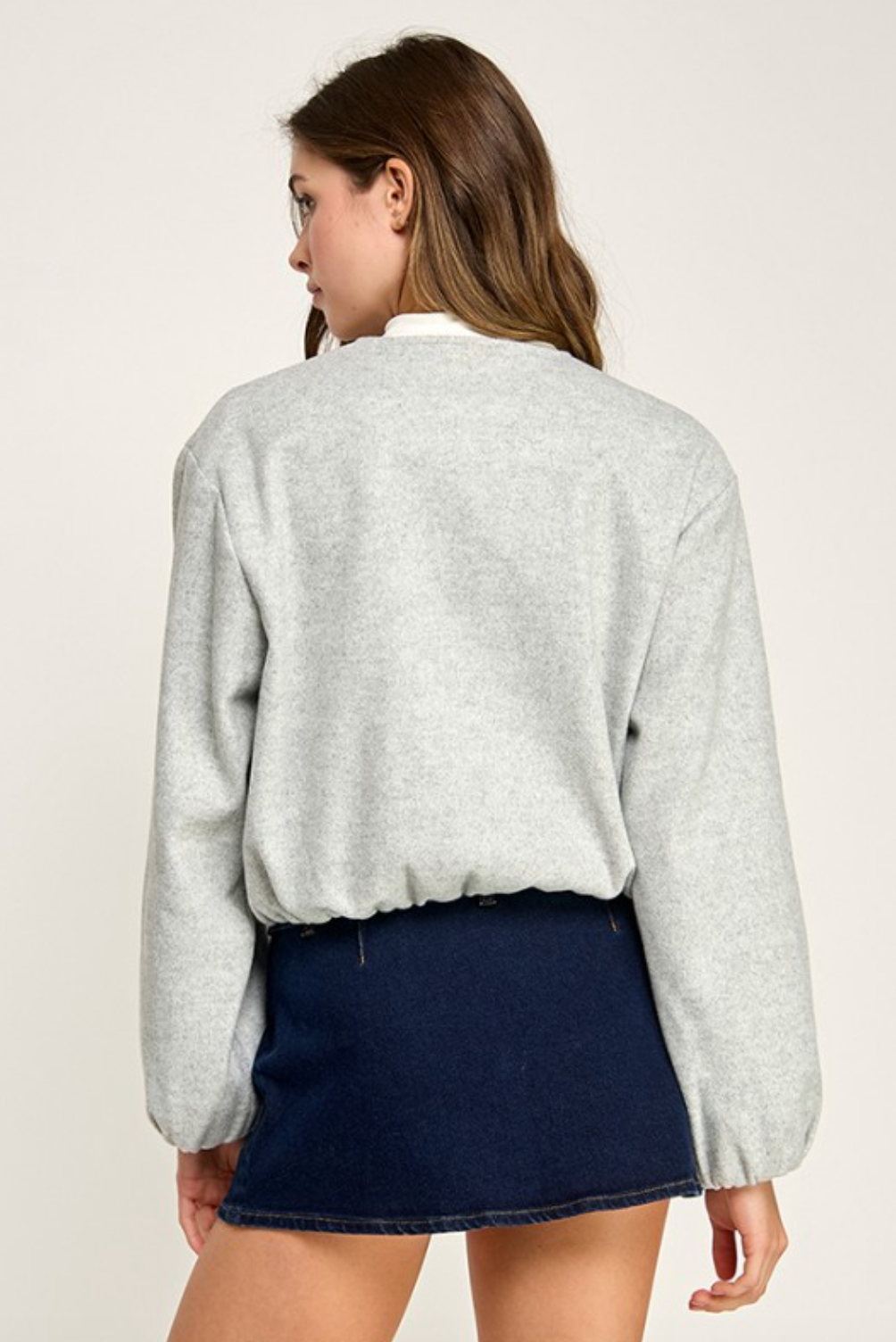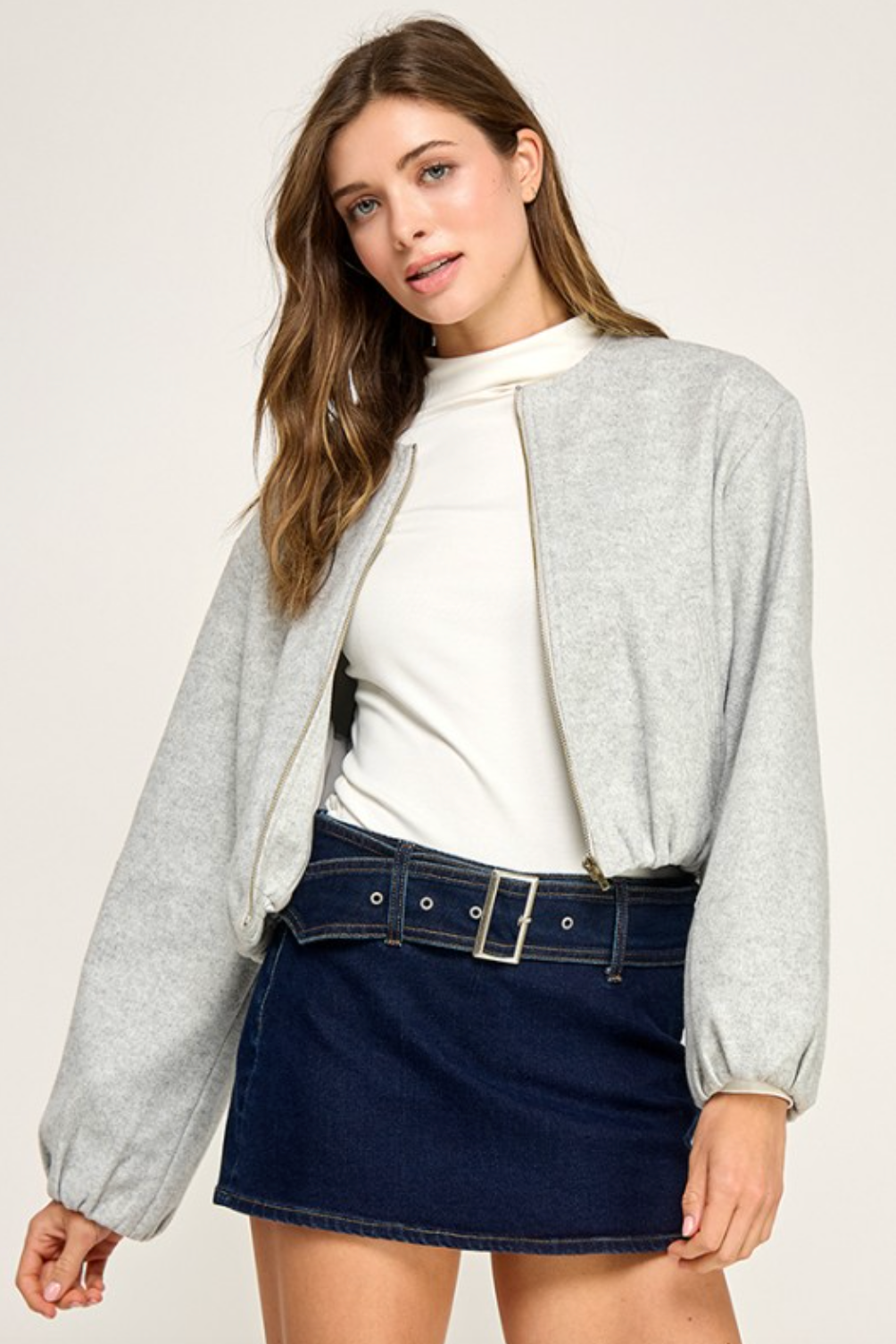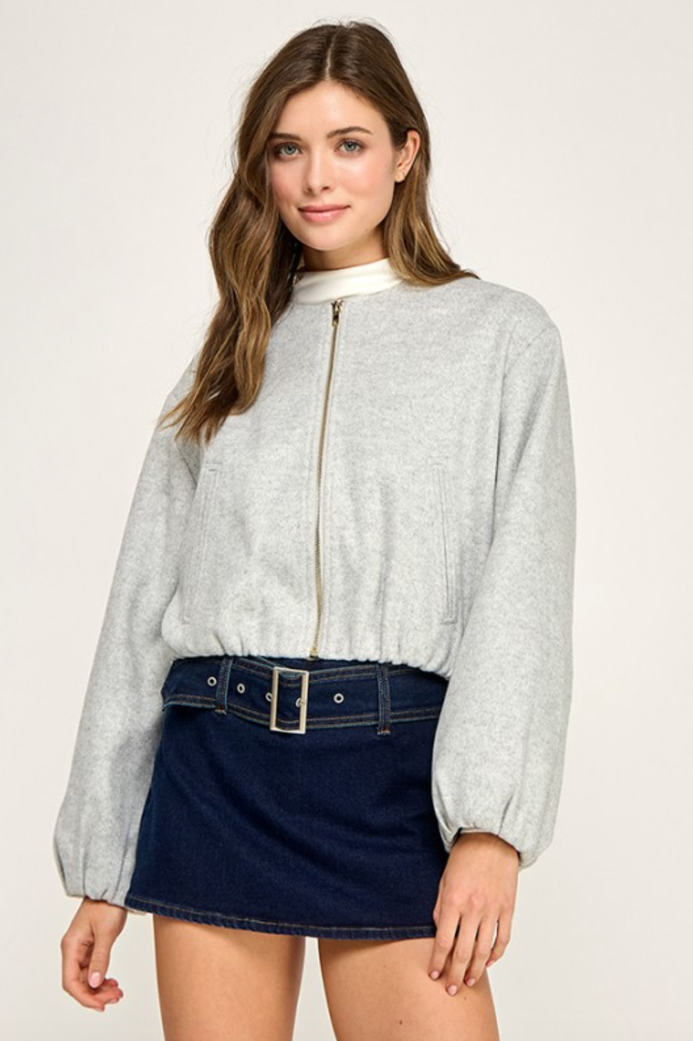 • The round neckline, voluminous pleated cuffs, and front pockets add playful dimension, while the front metal zip keeps things sleek.