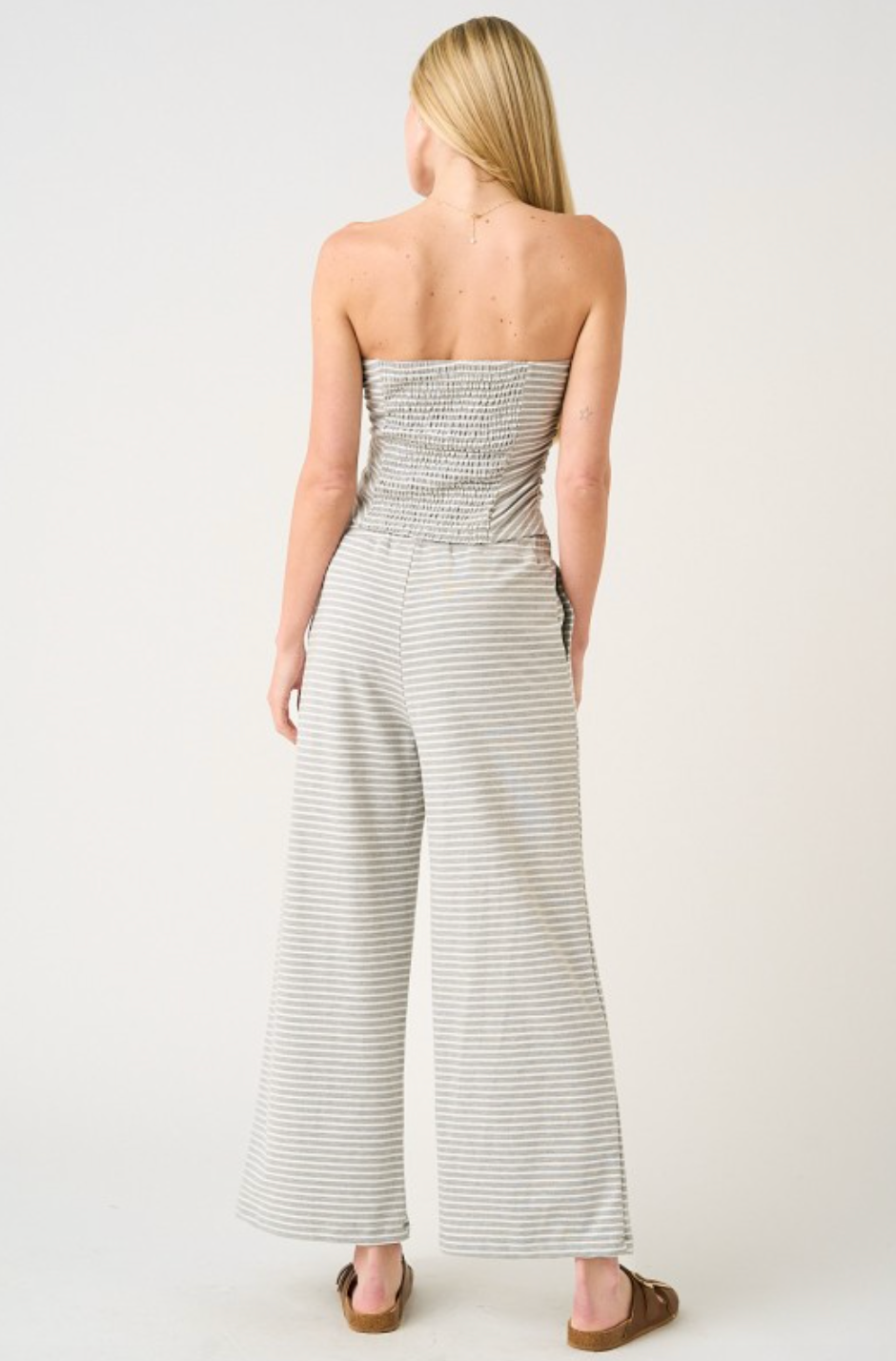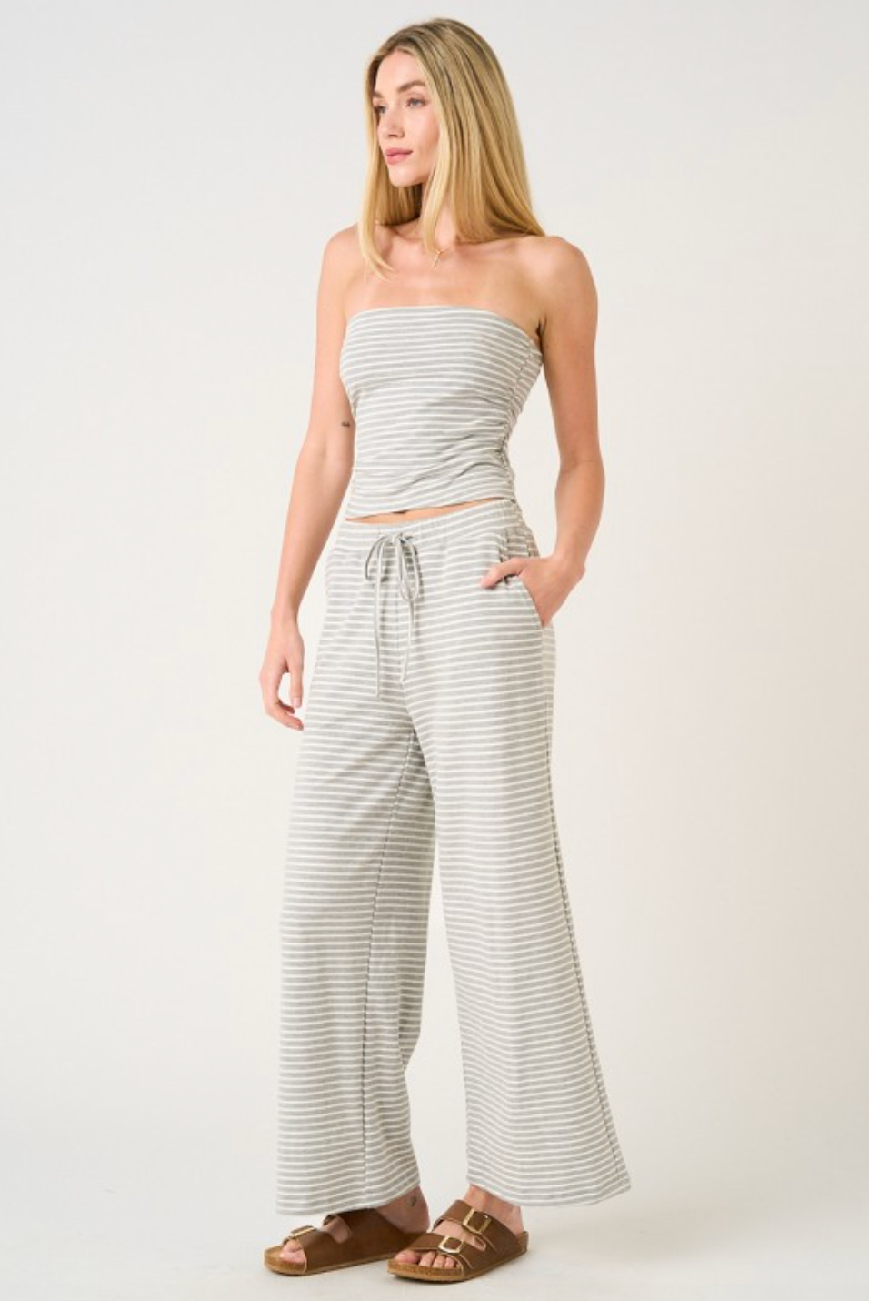 The sleeveless tube top features a smocked back for subtle texture and movement, while the matching pants deliver comfort with an elastic waist, drawstring, and practical side pockets.