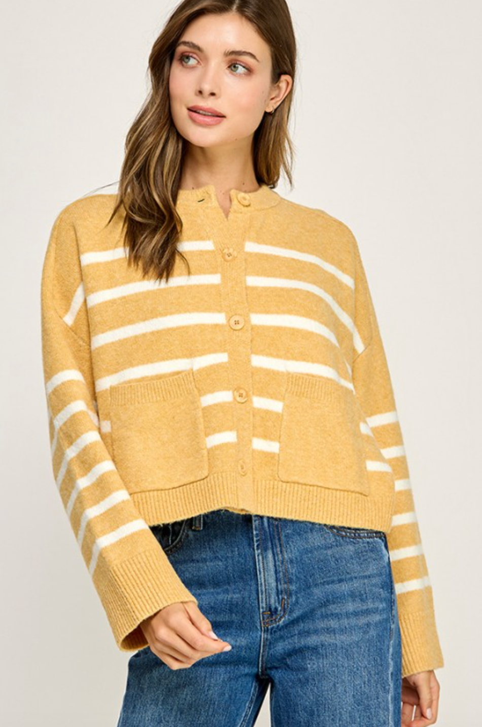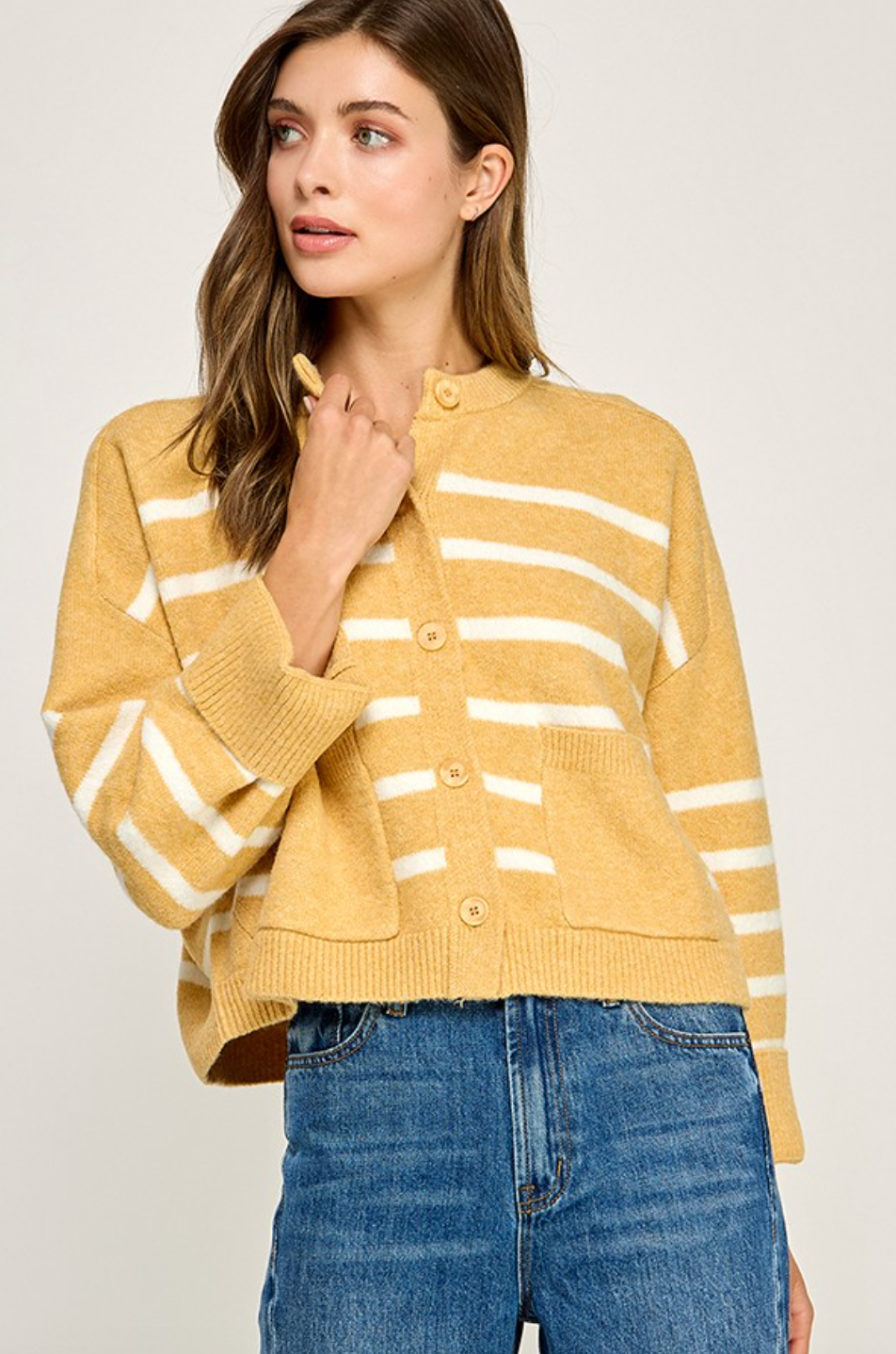 This relaxed cardigan features a bold stripe pattern that never goes out of style, paired with a laid-back silhouette that's perfect for effortless mixing and matching. Button up the front, slip your hands into the cozy front patch pockets, and let those drop shoulders do all the heavy lifting—literally.